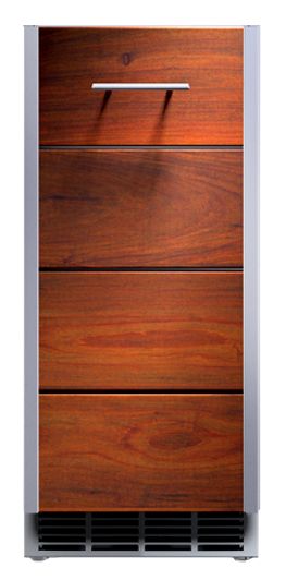 Arcadia Series: 15-inch wide, outdoor-rated, undercounter wine chiller with single door (left-hinged). Stores 20 bottles on five full-extension vinyl-coated shelves. Oiled Ipe wood overlay door. Marine-grade stainless steel. Appliance cabinets and back panels available.Read More